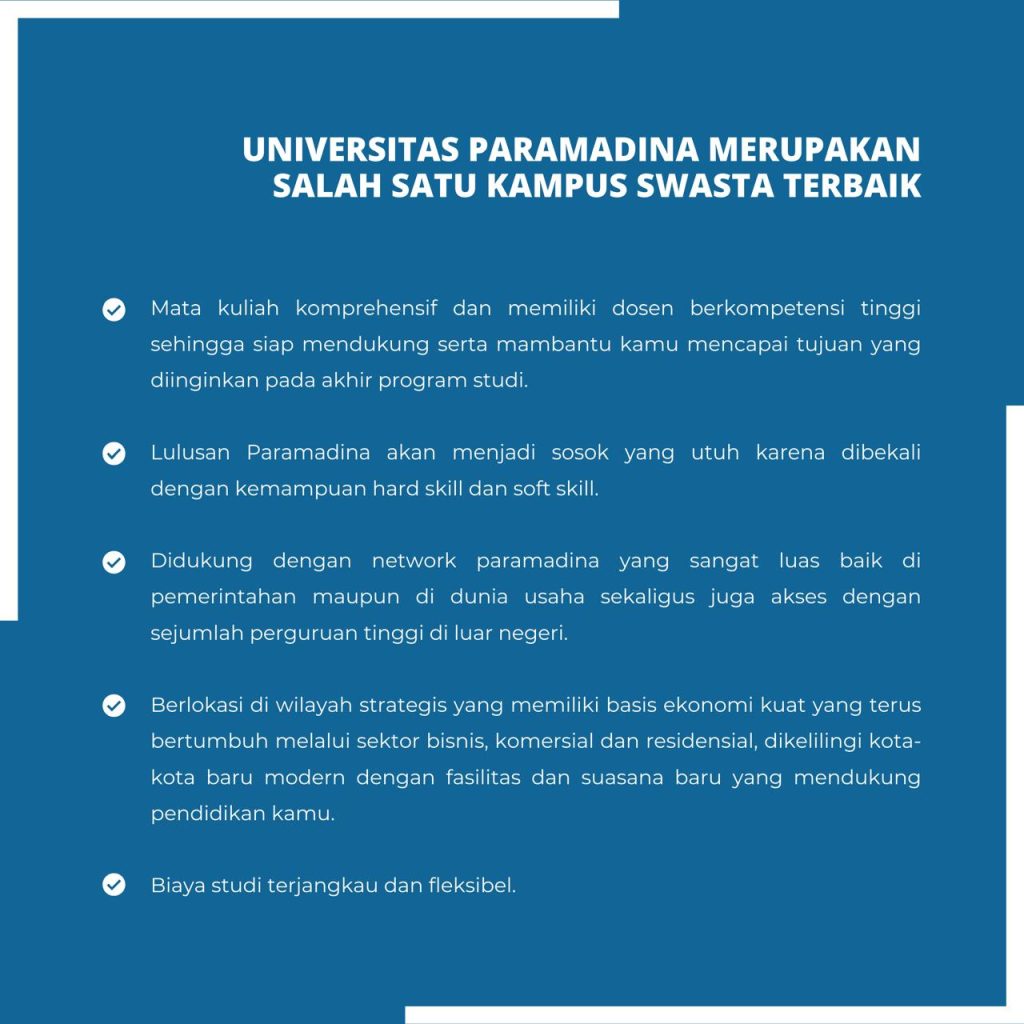 Lulusan Paramadina akan menjadi sosok yang utuh karena dibekali dengan kemampuan hard skill dan soft skill Mahasiswa berkesempatan ikuti kegiatan dengan nilai-nilai keparamadinaan yaitu leadership, entrepeneurship dan ethics.